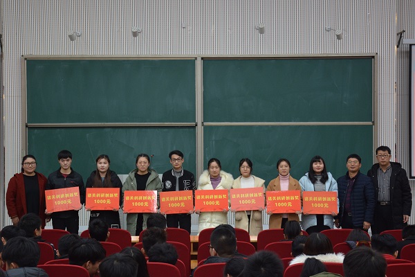 在龙子湖校区繁塔楼大教室七,与会领导首先为18禁直播 获得“诸美科研创新奖”的学生颁发奖学金。“诸美科研创意奖”由河南诸美种猪育种集团股份有限公司设立,金额1万元,旨在鼓励大学生在学习理论知识的同时积极参与科研项目,知行合一,学以致用。