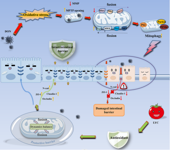 脱氧雪腐镰刀菌烯醇(又名呕吐毒素),是畜禽养殖中最常见、危害最大的真菌毒素之一,主要污染小麦、玉米等谷类作物和动物饲料。呕吐毒素可破坏肠黏膜结构与功能,使肠道屏障受损,危害动物健康的同时降低了生产性能。目前,无法做到霉变饲料中呕吐毒素的完全脱毒,残留的呕吐毒素长时间暴露对动物健康造成了严重问题。课题组前期研究发现线粒体损伤是呕吐毒素致肠损的核心机制。因此,探寻能缓解线粒体损伤的天然药物对于缓解呕吐毒素肠毒性作用和促进畜牧业高质量发展有现实意义。番茄红素是一种被国际公认的食源性营养素,被称之为“植物黄金”,具有抗炎、抗氧化、抗应激、保护线粒体等作用,并可增加了肠道紧密连接蛋白表达、改善了肠道屏障完整性。本课题围绕番茄红素是否能够抵抗线粒体损伤、调控线粒体自噬、维持线粒体稳态缓解呕吐毒素肠毒性这一科学问题开展了进一步研究。
