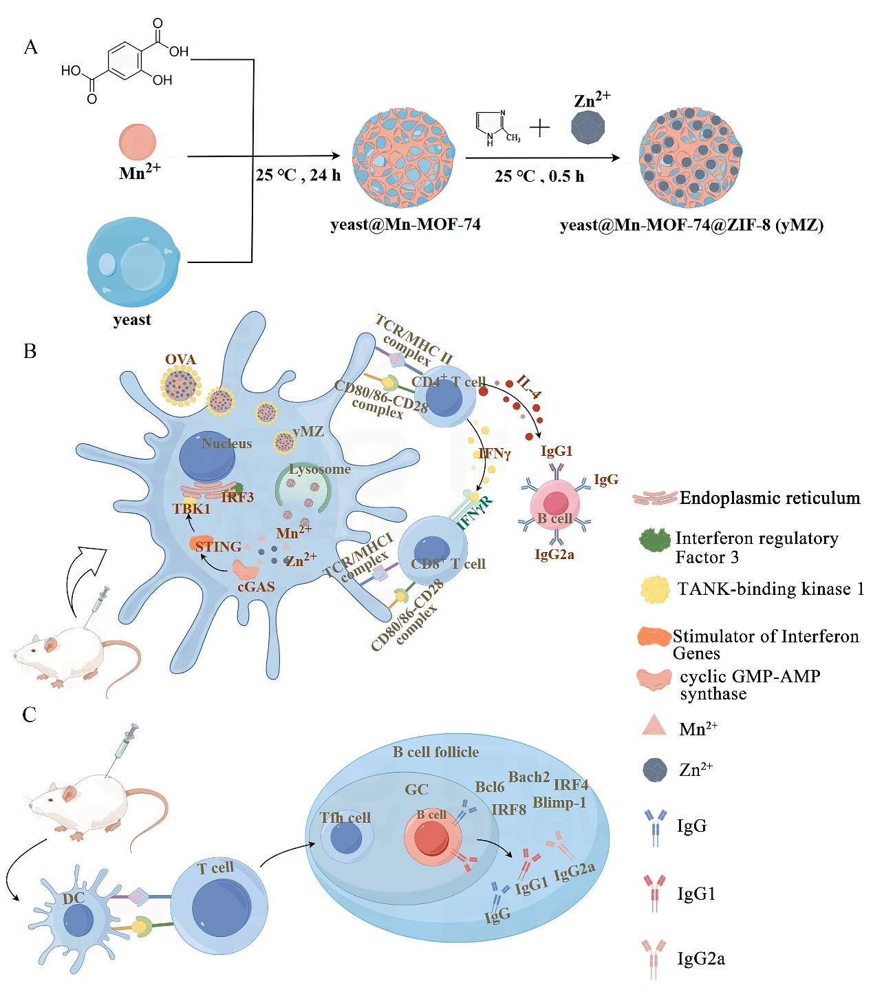 疫苗佐剂是增强疫苗免疫效果的关键组分,传统佐剂虽广泛应用,但存在效率有限、潜在副作用、不适合冻干或冷冻储存等问题。由于佐剂设计机制复杂,目前临床批准的佐剂种类较少,远不能满足疫苗研发需求。针对这一挑战,18禁直播 魏战勇教授团队提出新的解决方案:以酿酒酵母菌的菌体为模板,通过生物矿化在其表面逐层自组装锰基MOF(Mn-MOF-74)和锌基MOF(ZIF-8),构建新型复合佐剂yMZ(图1)。该技术突破三大难题:①组分协同增效:酵母细胞壁的甘露聚糖、β-葡聚糖与双金属MOF协同作用,激活cGAS-STING天然免疫通路,实现“1+1+1>3”的免疫增强;②安全性提升:MOF包覆减少金属纳米颗粒用量,避免毒副作用;③稳定性优化:克服传统纳米颗粒易团聚问题,适配冻干工艺,无需乳化,与抗原混匀后即可使用。