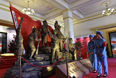 10月20日,两名观众在展览上参观。近日,中共云南省委宣传部、中共云南省委党史研究室等举办以“弘扬长征精神 决胜全面小康”为主题的云南省纪念红军长征胜利80周年主题展览。新华社记者 陈海宁 摄
