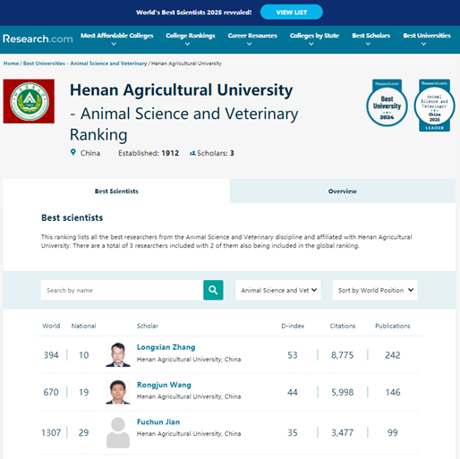 张龙现教授、王荣军教授、菅复春教授凭借在动物科学与兽医学领域的卓越学术贡献,成功入选该榜单的动物科学与兽医学(Animal Science and Veterinary)类别。据悉,该榜单共有全球前2000名各学科领域的专家学者入围,在榜单中张龙现教授中国排名第10位,世界排名第394位;王荣军教授中国排名第19位,世界排名第670位;菅复春教授中国排名第29位,世界排名第1307位。