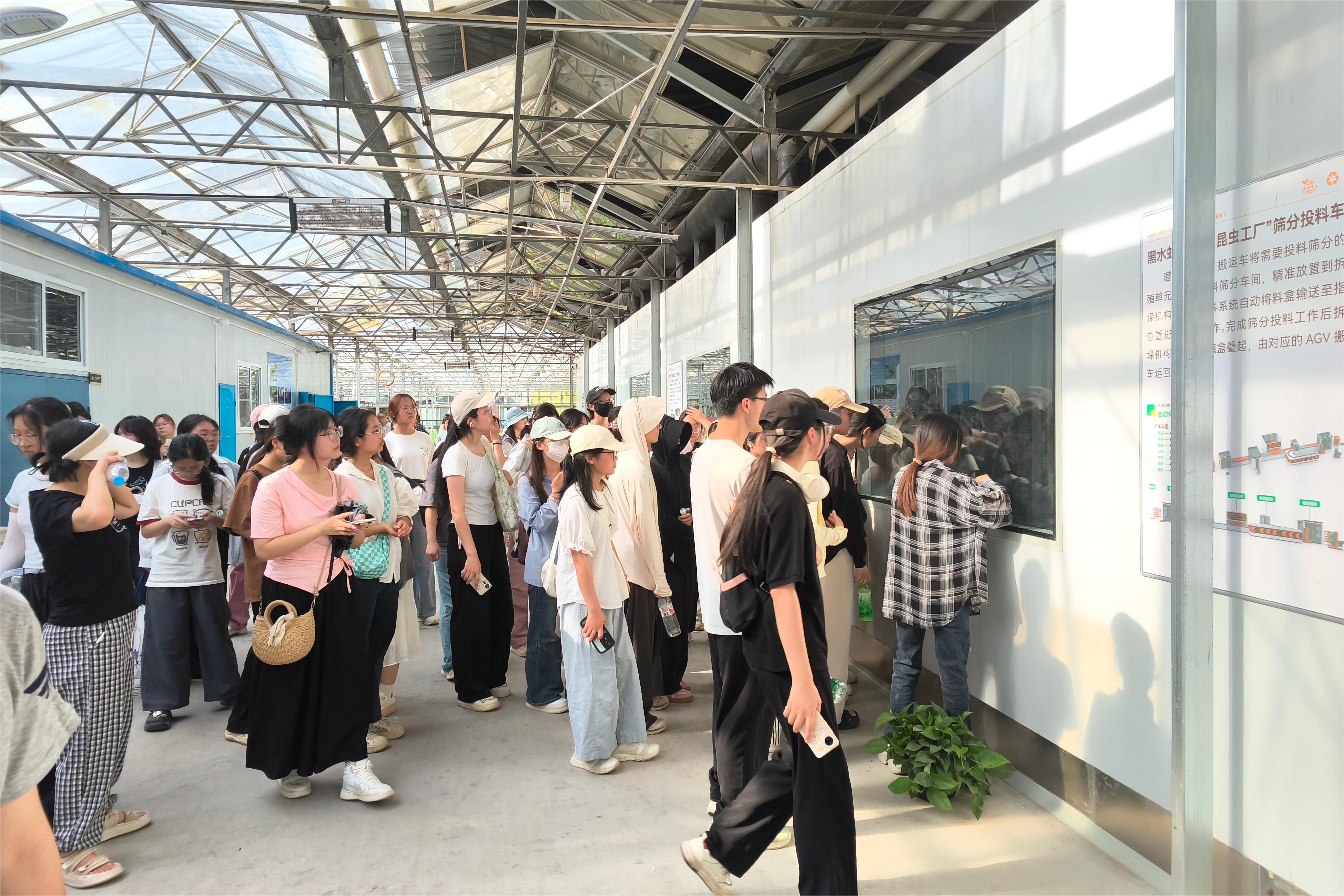 在副院长韩立强的带领下,同学们率先参观了杨森教授团队指导建设的黑水虻生物转化基地,讲解员系统展示了“虫-菌互作”技术在有机废弃物资源化利用中的创新应用。同学们通过实地观察黑水虻养殖全流程,深入了解昆虫蛋白转化技术对构建生态农业循环体系的重要意义。