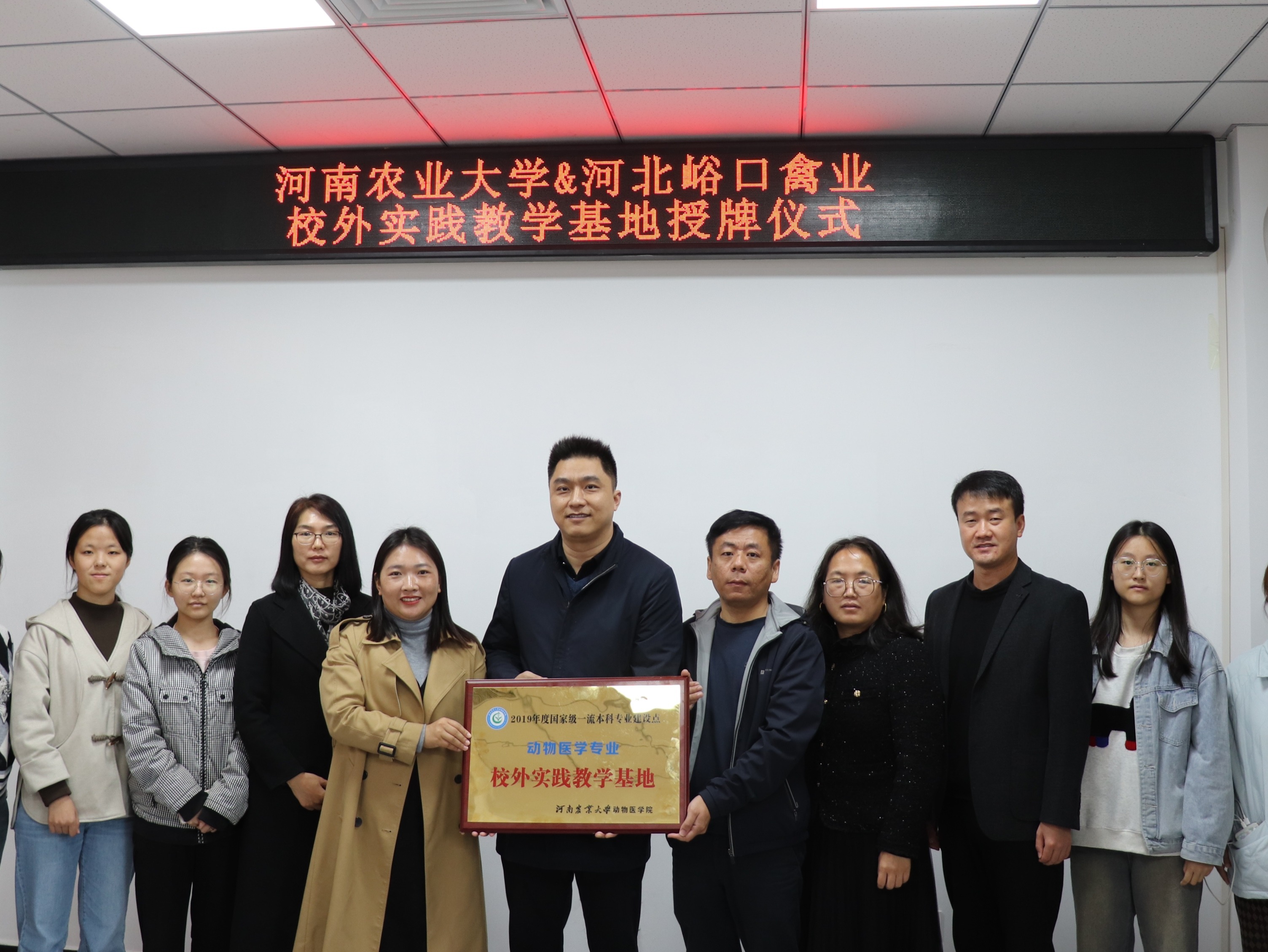 为了解本科生在岗实习情况和思想动态,关心学生实习生活,11月8日,副院长韩立强和实习带队老师张二芹、王艳玲赴河北峪口禽业、内黄县牧原农牧、滑县牧原三家实习单位看望实习生,为河北峪口禽业挂牌动物医学专业校外实践教学基地。河北峪口禽业负责人黄晓荣、席建伟等人员参加。