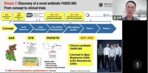 附:李健,澳大利亚莫纳什大学教授,美国微生物科学院院士、澳大利亚科学院院士、澳大利亚健康与医学科学院院士,国际抗微生物药理学会(ISAP)主席,国际知名期刊《国际抗微生物药物杂志,The International Journal of Antimicrobial Agents》主编。作为国际抗感染药理研究和新药研发的领导者,至今已发表高水平论文439篇(被引29387次,h-index指数83),多次被Web of Science评为药理学和毒理学的全球高被引学者(2015-2017,2022)。在美国国立卫生研究院(NIH)的资助下,李健院士团队从小分子化合物设计到临床试验,研发了一种新型脂肽药物FADDI-365,用于抗多重耐药革兰氏阴性病原体,已超预期完成第I阶段的临床试验。他首次提出黏菌素给药建议及多黏菌素E临床科学使用指南,该成果已被欧洲药品管理局采纳,改善了全球的临床实践应用。2015年获澳大利亚国家卫生与医学研究委员会十佳研究项目,2017年获澳大利亚科学院中青年实验生物医学最高奖雅克·米勒奖章。