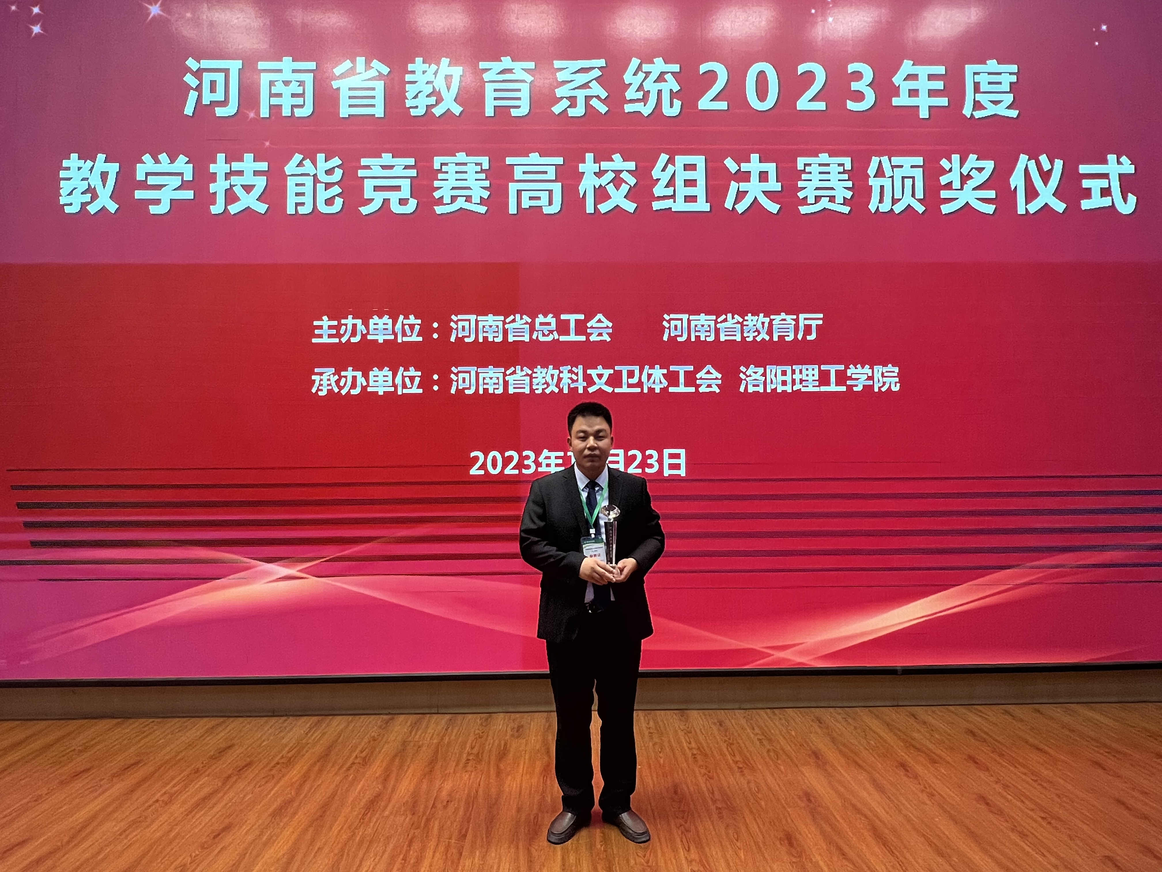 10月22日至23日,由河南省总工会、河南省教育厅主办的河南省教育系统2023年教学技能竞赛决赛在洛阳举行。经过激烈角逐,18禁直播 金鑫老师位列医科组第三名,荣获一等奖的好成绩,并被河南省总工会、河南省教育厅授予“河南省优秀教学标兵”荣誉称号。