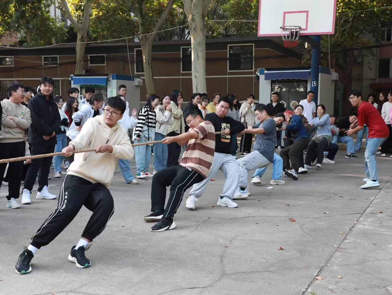 于文化路校区东北角篮球场举办2023级“迎新杯”新生拔河比赛,辅导员冯杰、全体助理班主任和23级全体学生参加比赛。