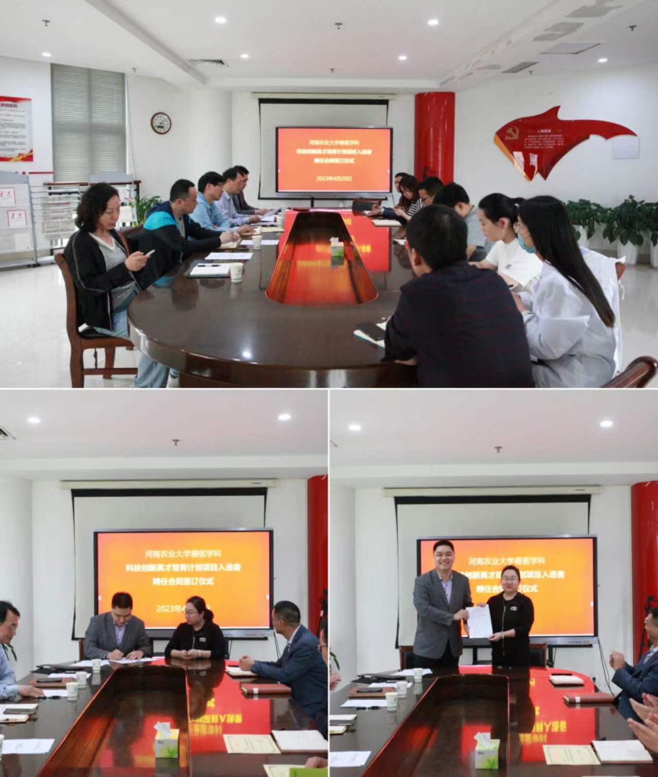 在第一实验楼430会议室举行兽医学科科技创新英才培育计划项目入选者聘任合同签订仪式。学院全体班子成员出席会议,6位项目入选者参加签订仪式。会议由院长张龙现主持。
