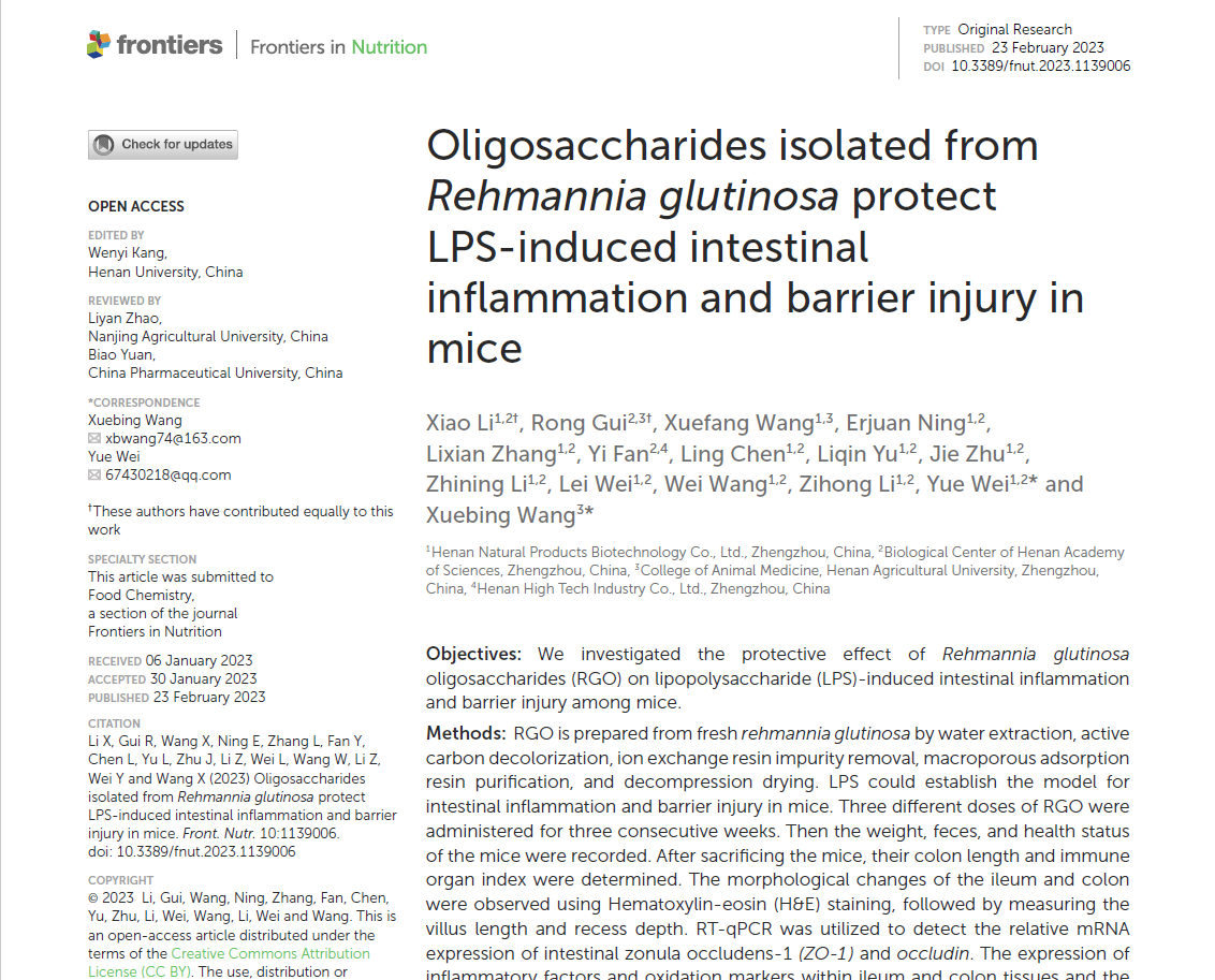 临床兽医学科王学兵教授科研团队在中药成分连翘酯苷A、地黄低聚糖的药理机制研究方面取得新进展,相关科研成果以“Forsythoside A regulates autophagy and apoptosis through the AMPK/mTOR/ULK1 pathway and alleviates inflammatory damage in MAC-T cells”、“Oligosaccharides isolated from Rehmannia Glutinosa protect LPS-induced Intestinal Inflammation and Barrier Injury in Mice”为题分别发表在《International Immunopharmacology》(IF:5.714)、《Frontiers in Nutrition》(IF:6.590)等国际知名学术期刊上。王学兵教授为论文通讯作者,临床兽医学科硕士研究生张兴、归荣、张华强,河南省科学院李晓副研究员,临床兽医系青年教师童超博士分别为论文一作或通讯作者。