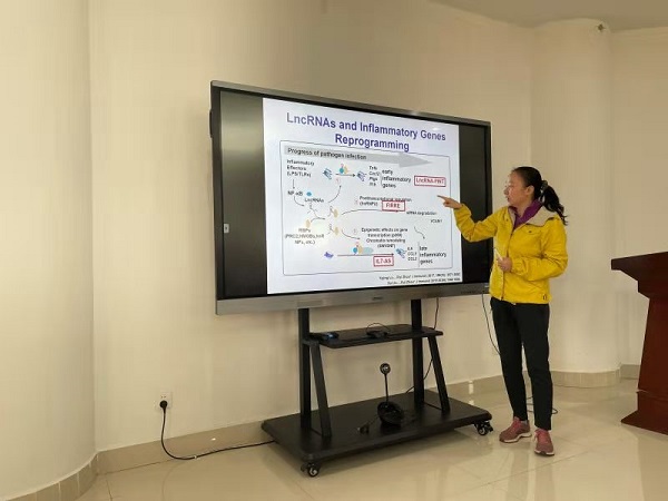 报告会上,周蕊教授对非编码RNA及相关的RNA结合蛋白在炎症因子程序性调控中的作用做了阐述。同时,详细讲解了一种新型NF-κB调控的lncRNA-FIRRE,通过与hnRNPU相互作用来共同调节VCAM1和IL12p40炎症基因的表达和RNA结合蛋白KSRP蛋白在日本血吸虫感染所导致肝纤维化进程中的正向调控作用,为肝纤维化疾病的治疗提供了新的思路。