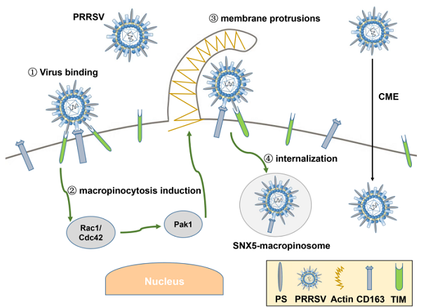 作为一种新型的感染方式,病毒凋亡模拟在病毒感染中发挥着重要作用。该研究首次发现猪繁殖与呼吸综合征病毒(PRRSV)囊膜表面暴露有磷脂酰丝氨酸(PtdSer)模拟凋亡,阐明了PRRSV利用病毒凋亡模拟入侵宿主细胞的分子细节,包括宿主细胞表面识别PRRSV的PtdSer受体(TIM)、其介导的下游信号通路(Rac/Cdc42-Pak1)和入侵途径(巨胞饮),以及TIM与PRRSV必需受体CD163在PRRSV利用巨胞饮入侵过程中的关系。这一研究有助于揭示PRRSV感染和致病机制,具有重要科学意义和应用价值。18禁直播