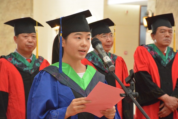 随后,本科生毕业生代表2015级水产养殖2班石今朝带领全体毕业生高呼三遍牧医精神,重温牧医精神带来的感动与激励。研究生毕业生代表2016级动物遗传育种与繁殖专业田卫华上台发言。她以自己七年来在牧医的求学经历为出发点,感慨牧医是她成长的见证者、精神的指引者,同时她也见证了牧医的发展。她表示,在这的七年里自己收获了很多,当离别时刻到来时,更是发现十六字的牧医精神已深入到了骨血之中。石今朝回顾了大学四年学习、工作感受,牧医这个大家庭带给自己太多的感动,太多的不舍。在这依依惜别之际,他感慨时光飞逝,但牧医将成为大家心中永远无法抹去的独家记忆和心灵圣地,由届届牧医人不断接续新的篇章。