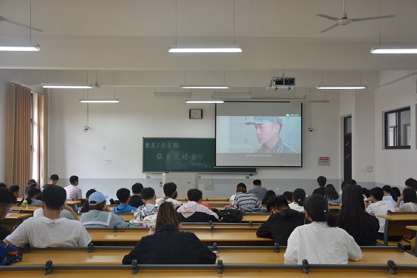 退役学生常腾上台,向与会学生分享自己的参军经历与感悟收获。最后,与会人员一同观看了《2019年征兵宣传片》。