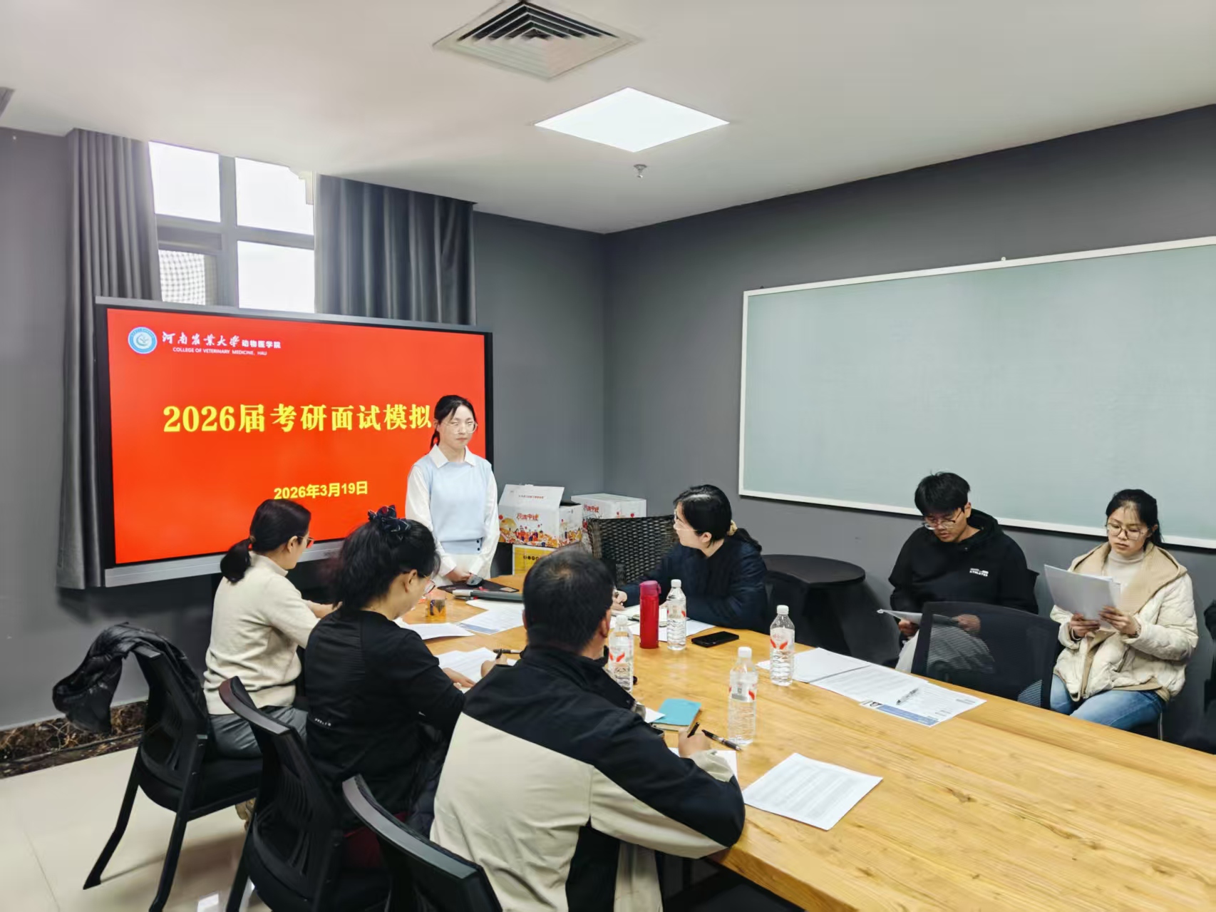 于3月19日在第一实验楼举办2026年考研复试一对一模拟面试指导会。本次指导会分为三组开展,学院党委副书记杜家方,导师代表万博、菅复春、赵友宝、商艳红、吴华等,团委老师冯佟、毋亚运出席活动,为即将参加复试的学生提供专业指导。