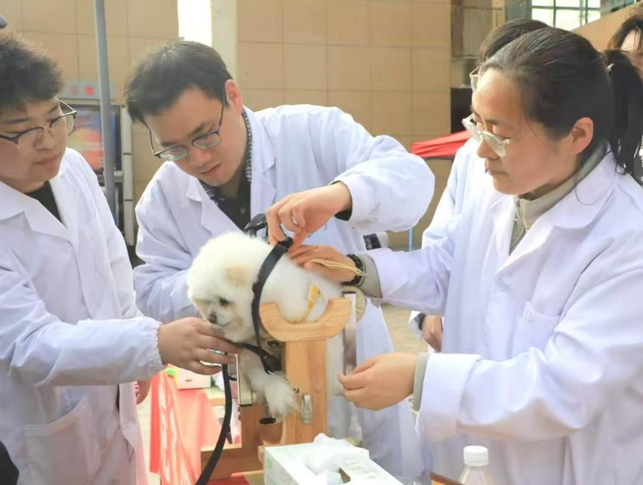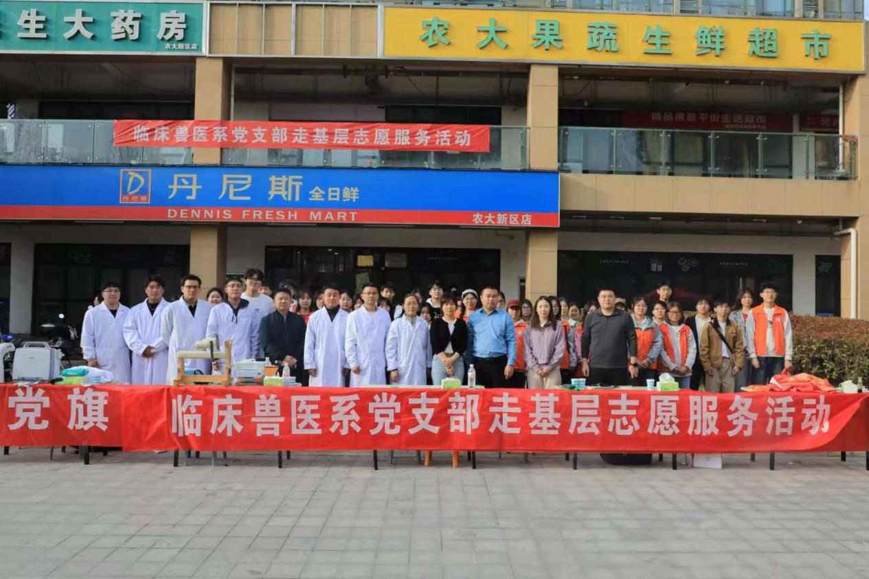 在龙子湖校区家属院超市广场举办“党旗领航践初心 宠物义诊暖民心”主题党日活动。临床兽医系党支部全体党员师生及志愿者共同参与此次活动。